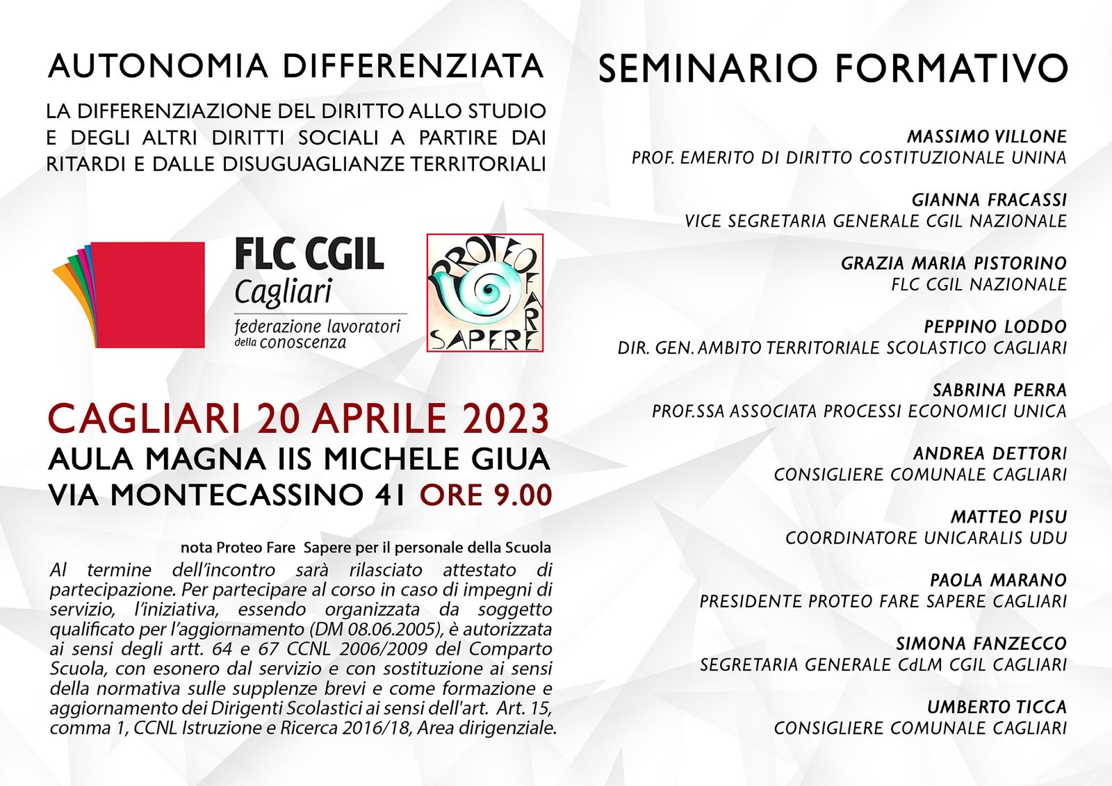 SEMINARIO DI FORMAZIONE “ Autonomia differenziata - La differenziazione del diritto allo studio e degli altri diritti sociali a partire dai ritardi e dalle diseguaglianze sociali ” - Cagliari 20 aprile